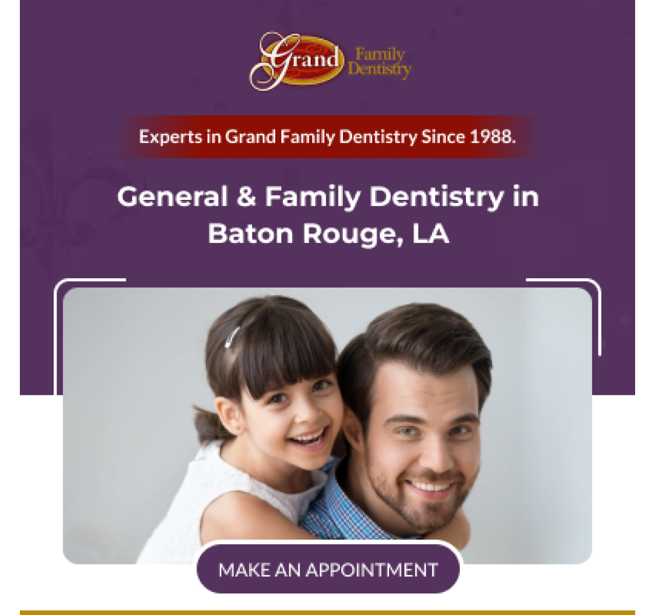 Grand Family Dentistry is a leading dentist in Baton Rouge offering professional care for all ages. From dental implants to dental veneers and cosmetic services in Baton Rouge, our team is dedicated to creating healthy, beautiful smiles. Our all-inclusive dental services include everything from routine cleanings and exams to advanced cosmetic dentistry, orthodontic dental treatments like Invisalign, and specialized pediatric dentistry for your little ones. We also offer restorative dentistry and periodontics to restore and protect your teeth. No matter your needs, we’ll make sure your smile gets the care it deserves in a welcoming, comfortable environment.
