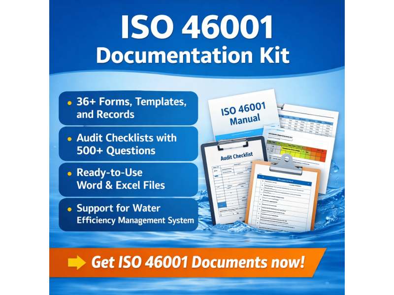 The ISO 46001 documentation kit offers a ready-to-use solution with complete ISO 46001 documents in editable formats. It helps organizations establish and maintain an effective Water Efficiency Management System with ease. Developed by experts, this kit ensures quick implementation and compliance.